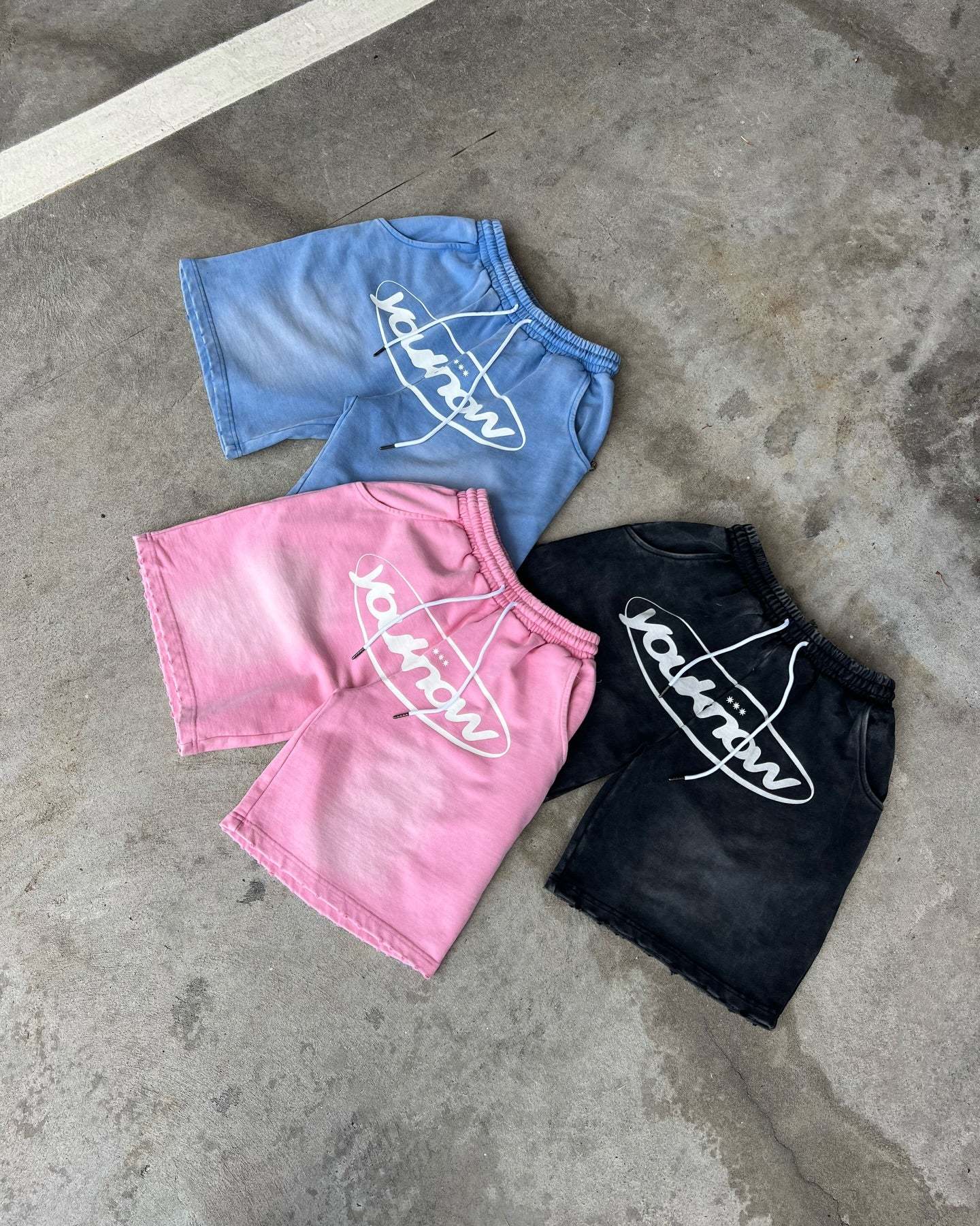 The Acid Wash Shorts are a boxy fit with subtle distressing at the hems and coverstitch/topstitch detailing for a cohesive, worn-in look.