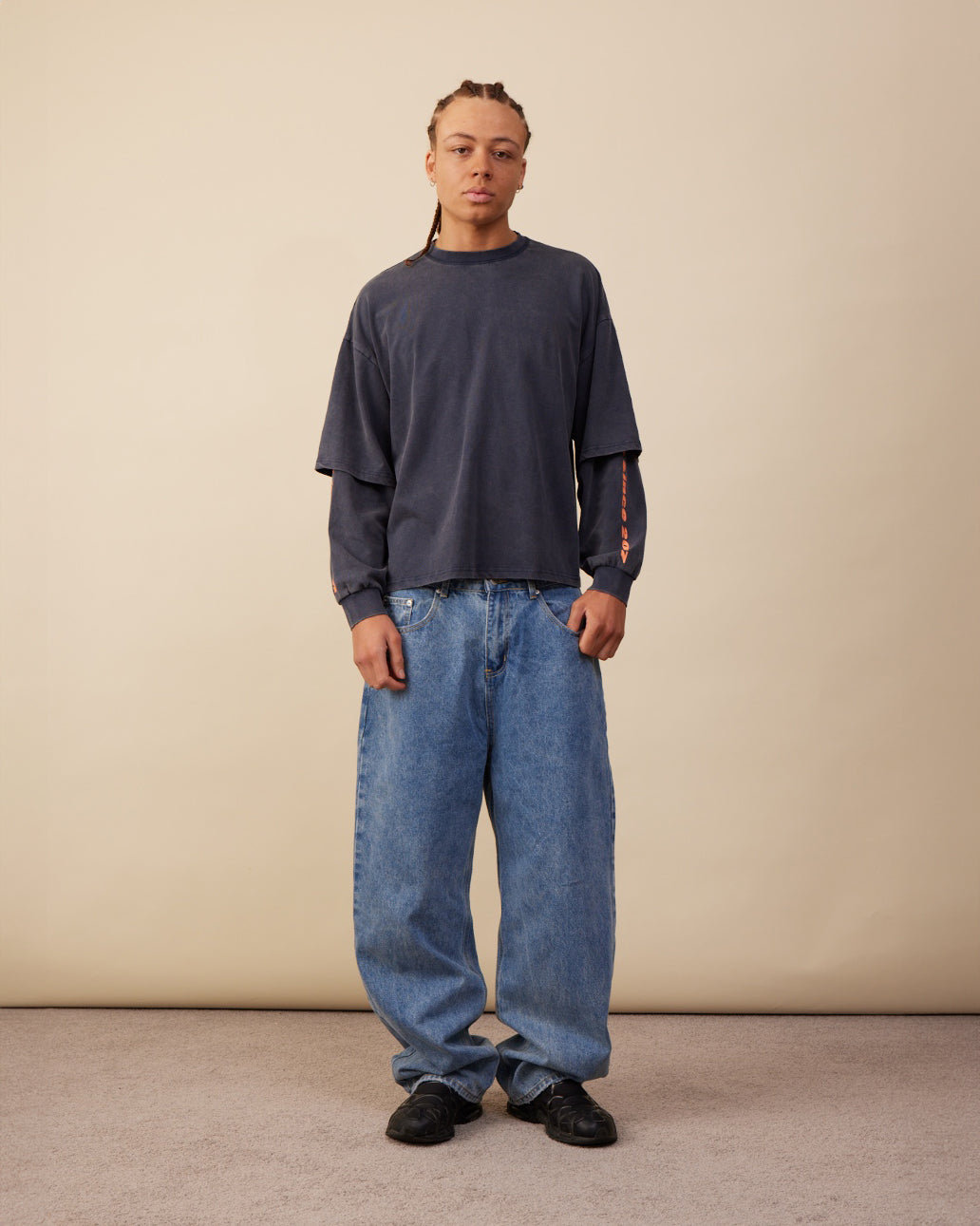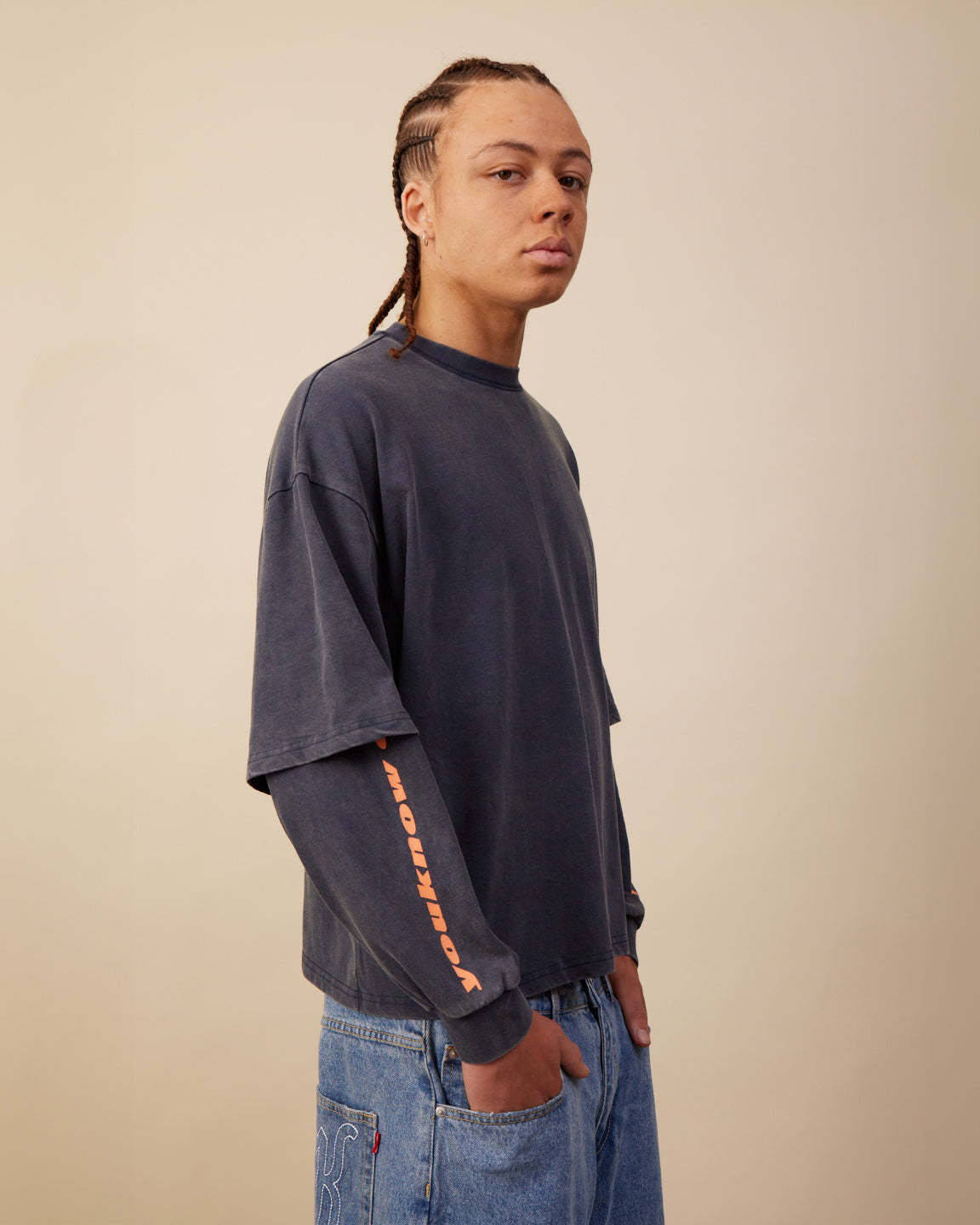 The Layered Longsleeve Boxy Tee combines a relaxed boxy short-sleeve layer over a cuffed long-sleeve base for a modern, layered look. Graphic print detailing is featured on both the sleeves and the back, while a worn-in, washed effect gives the piece a vintage-inspired feel.