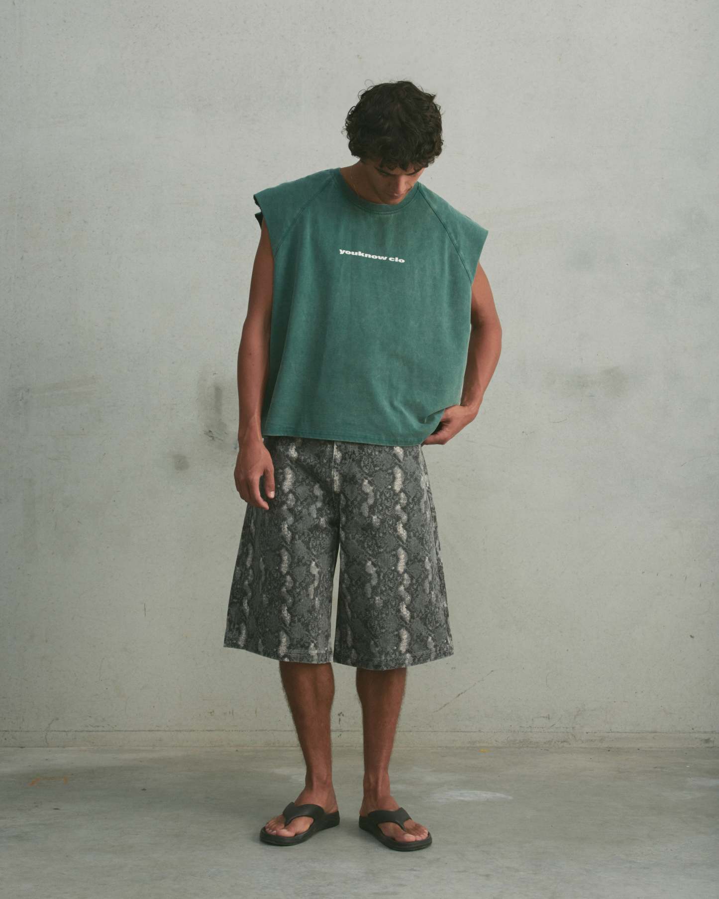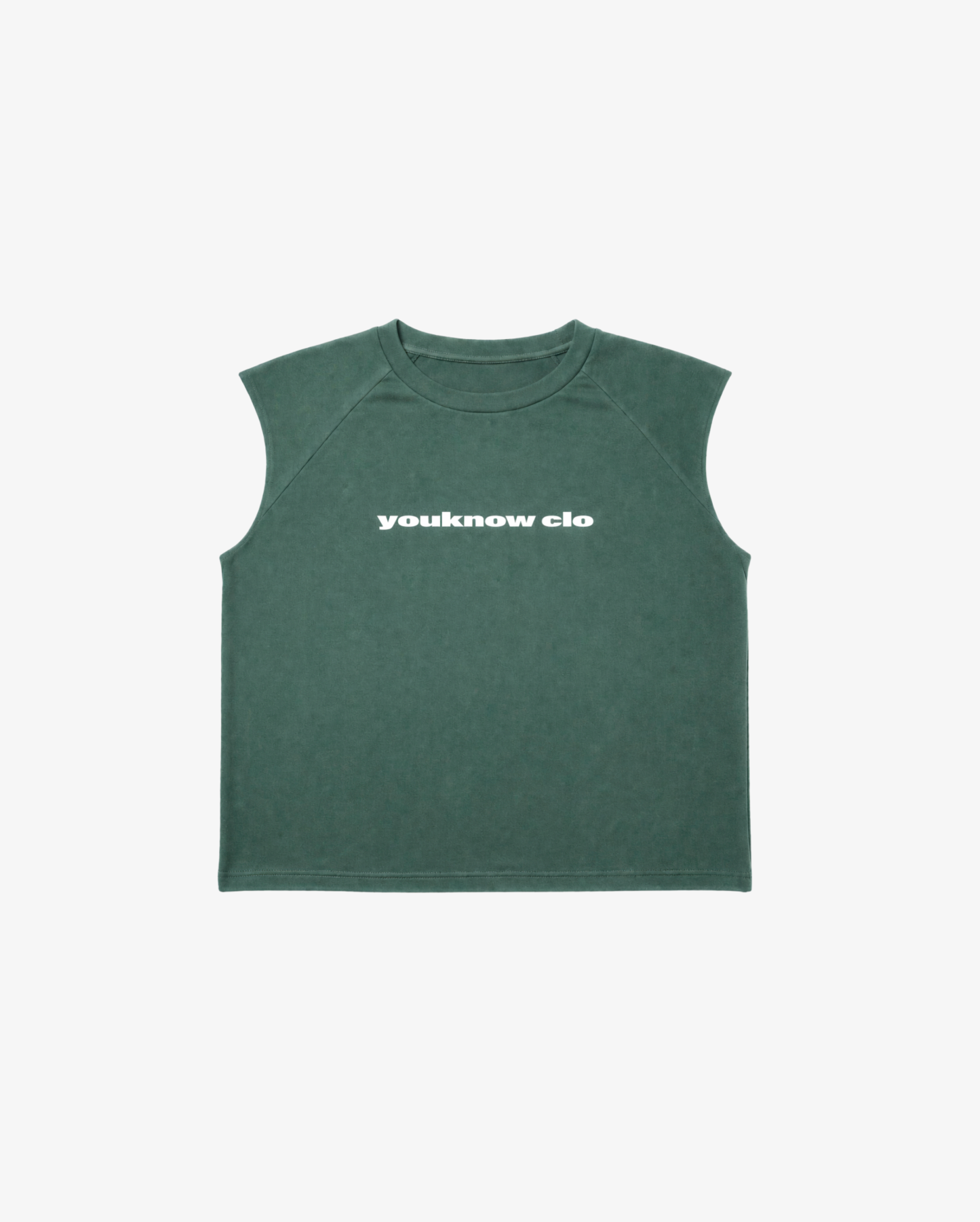 The Oversized Raglan Tank features a relaxed, boxy fit with raglan-style sleeves, a washed finish, a YOUKNOW. logo print on the front, and embroidered star detailing at the back neck.