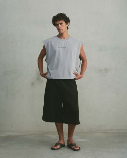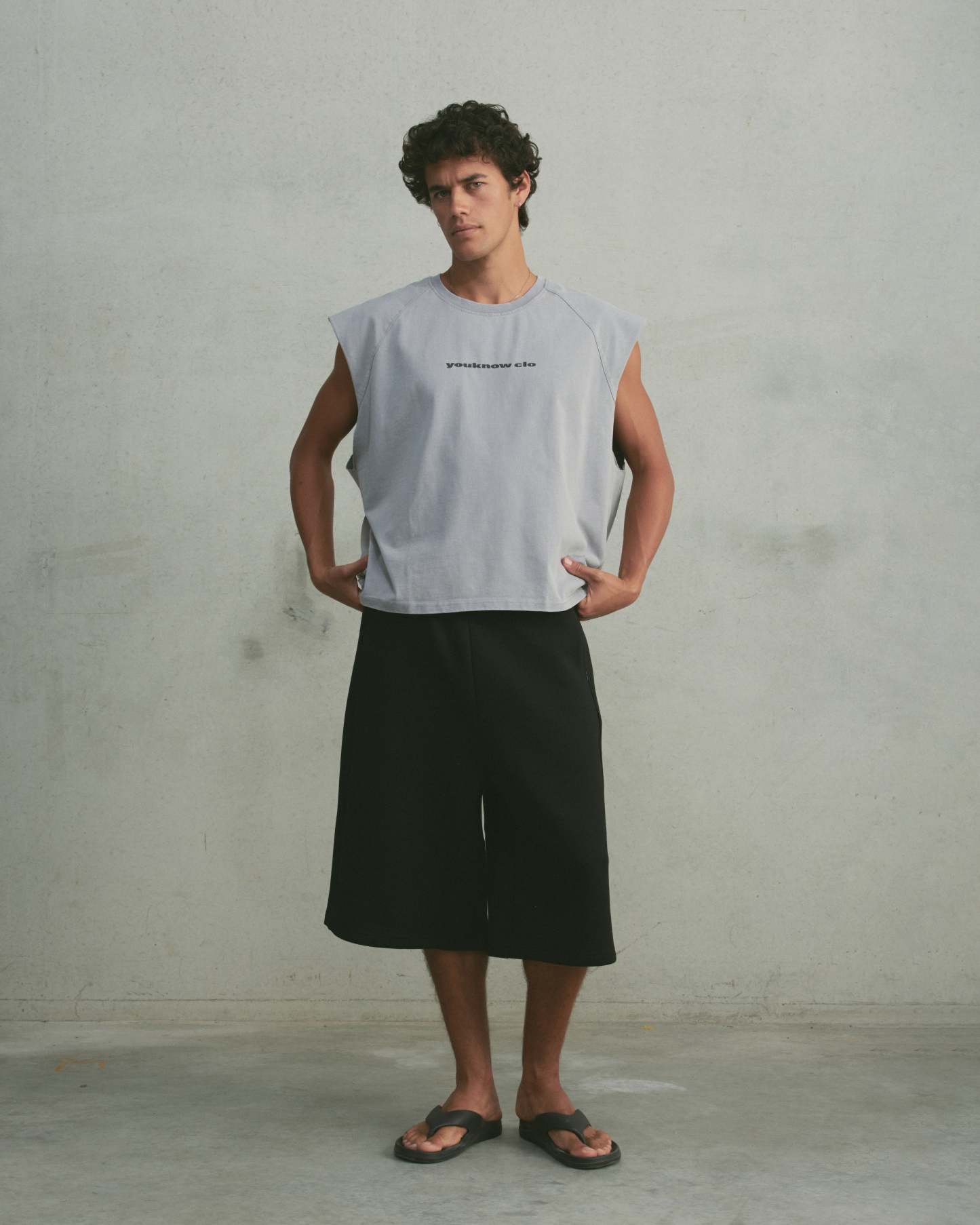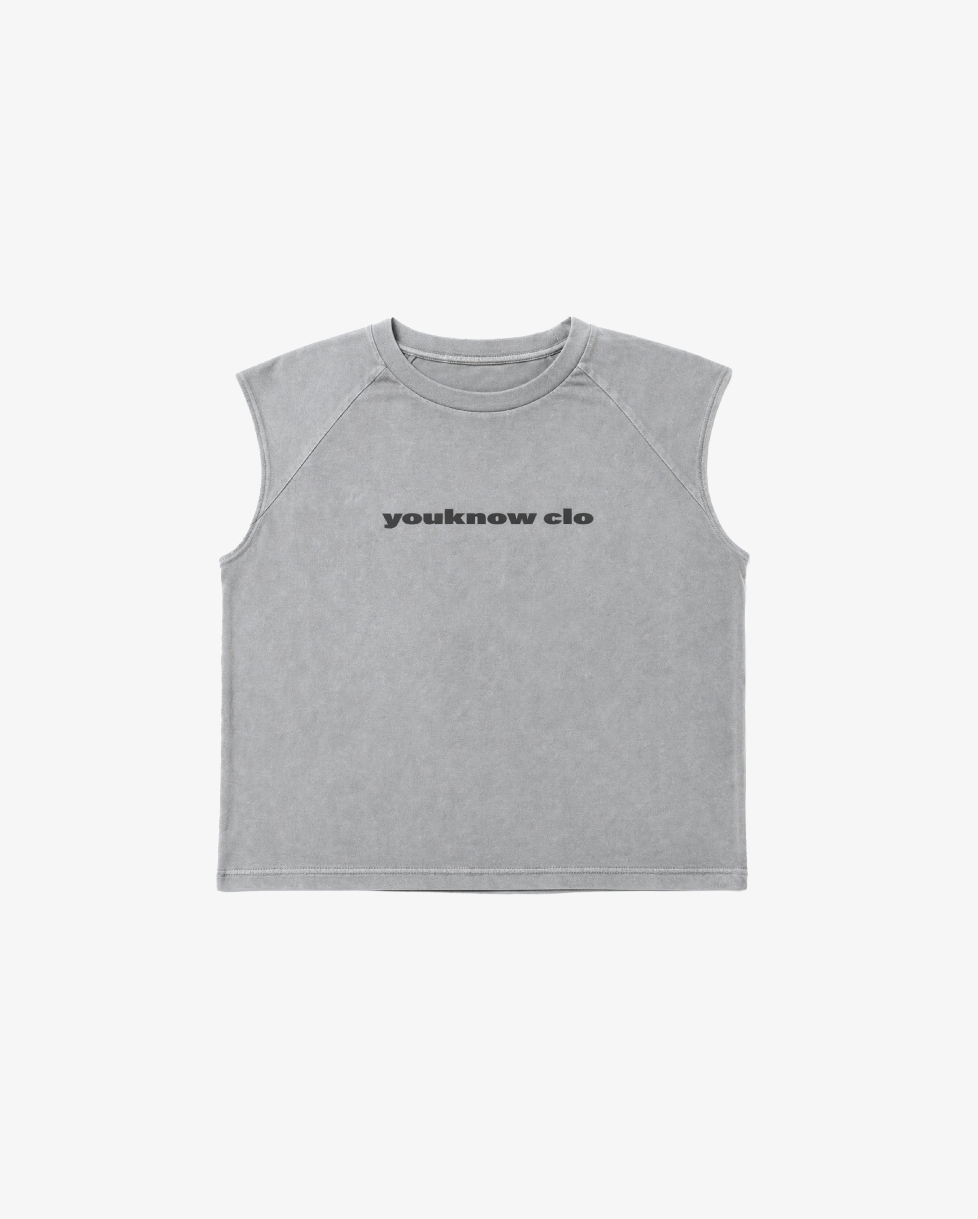The Oversized Raglan Tank features a relaxed, boxy fit with raglan-style sleeves, a washed finish, a YOUKNOW. logo print on the front, and embroidered star detailing at the back neck.