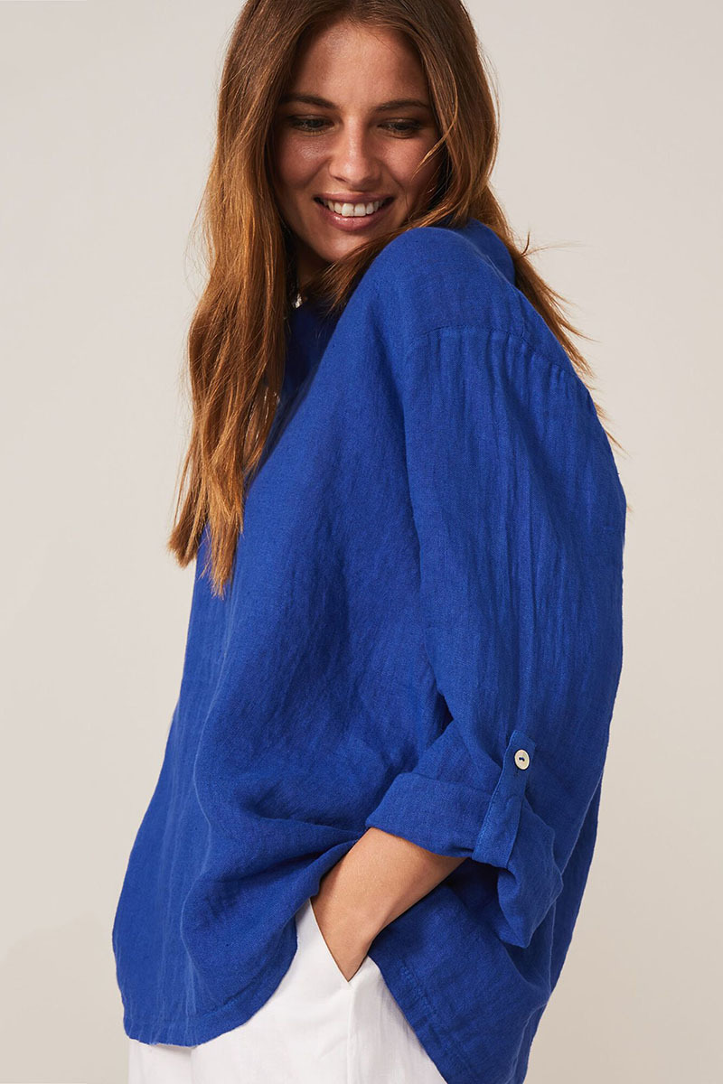 Designed with a draped neckline, this more subtle linen fabric still feels relaxed and a whole new way to wear it with one of our favourite fabrics.