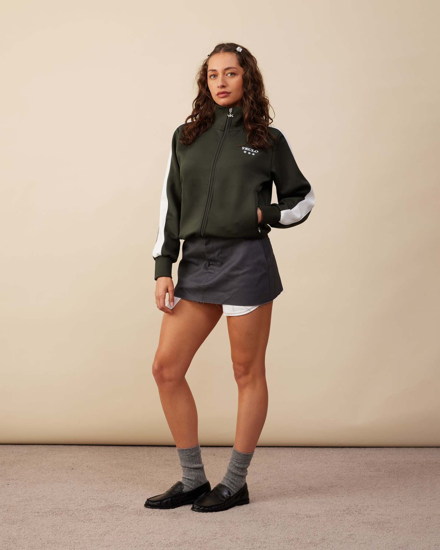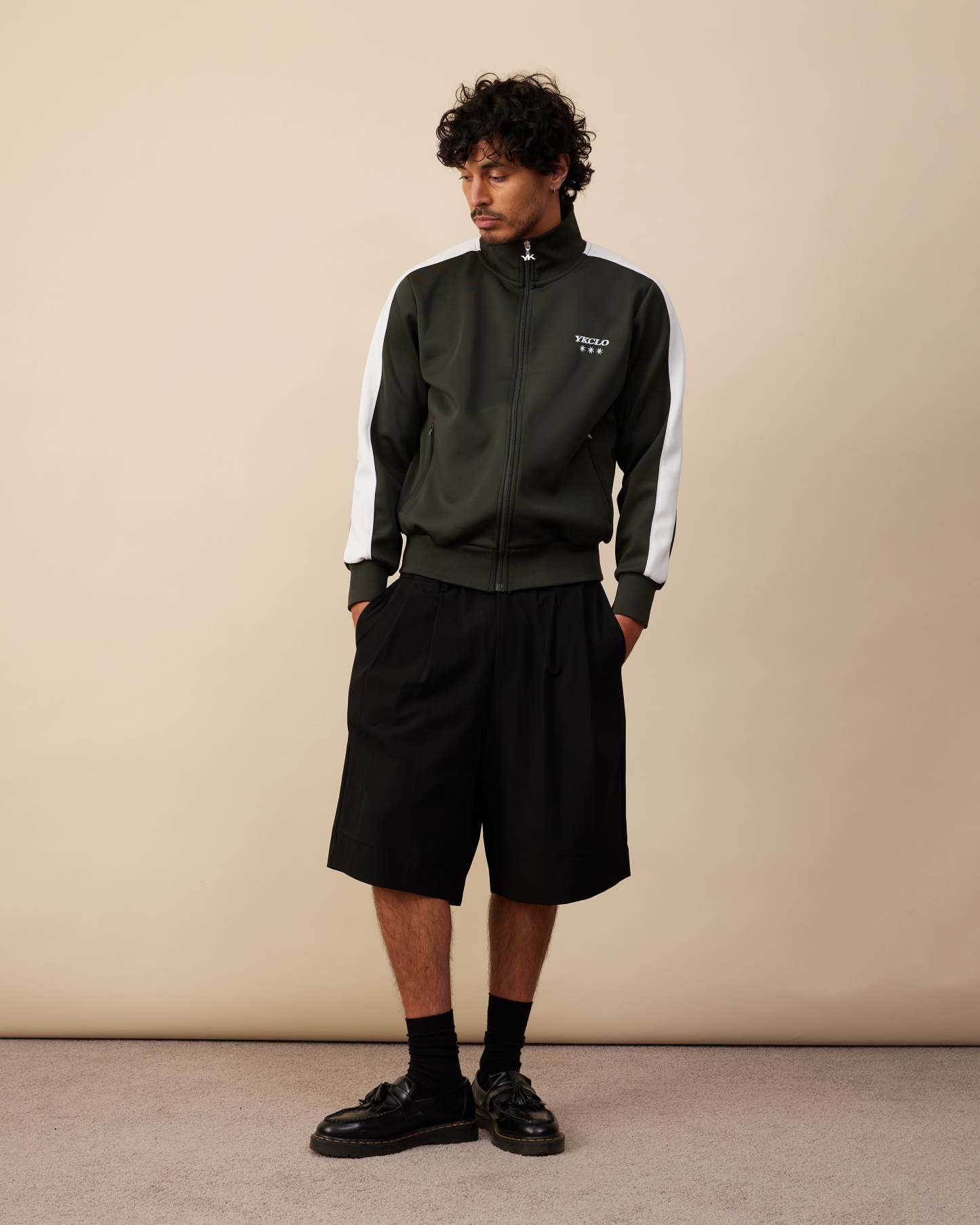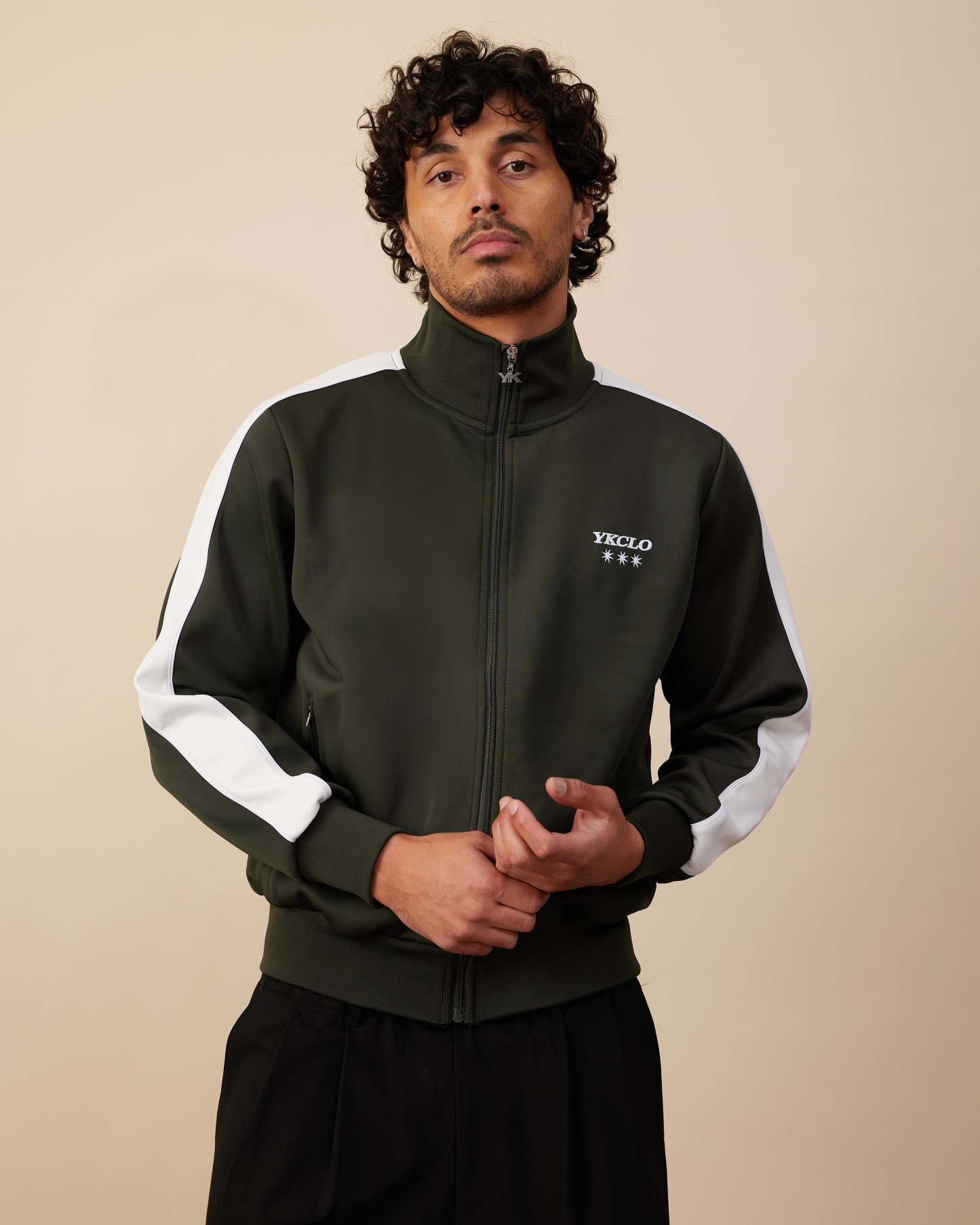 The Track Jacket features a relaxed fit with a full front zip and stand-up collar. Designed with zip pockets, ribbed hem and cuffs, and panel detailing down the arms, it’s finished with a signature YK-branded zipper.